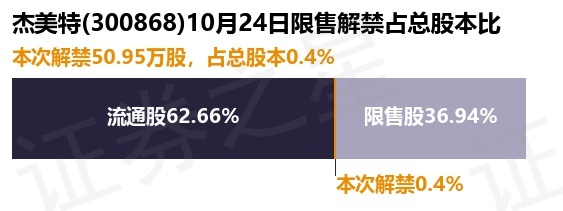 杰美特(300868)50.95万股限售股将于10月24日解禁,占总股本0.4%