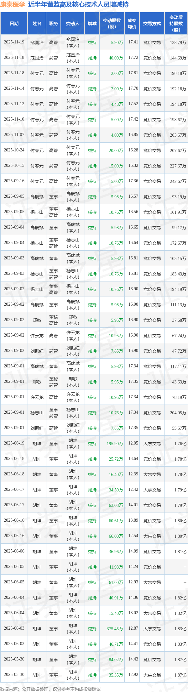 康泰医学近半年内的董监高及核心技术人员增减持详情如下: