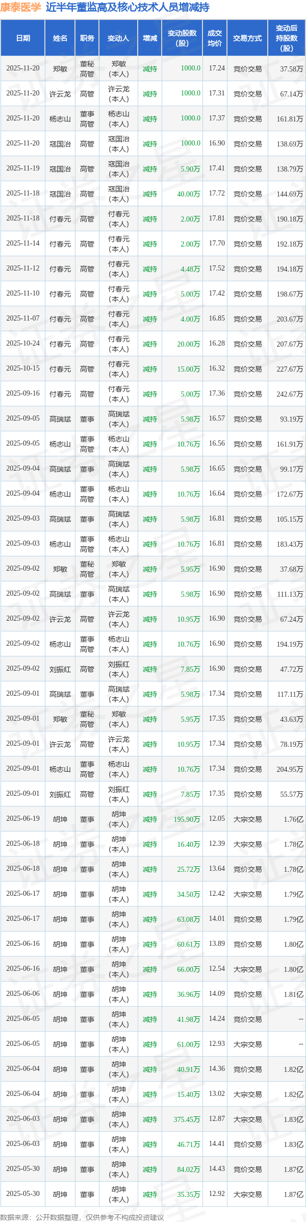 康泰医学近半年内的董监高及核心技术人员增减持详情如下:
