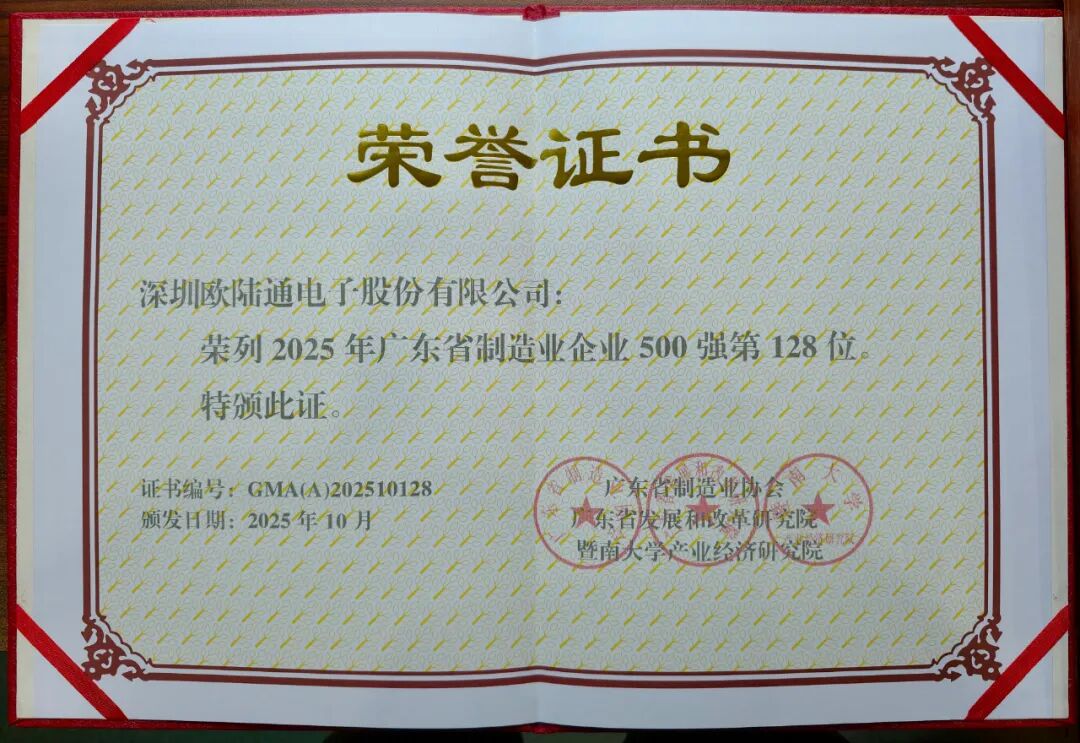 再攀新高!欧陆通荣登“2025广东省制造业500强企业”第128位
