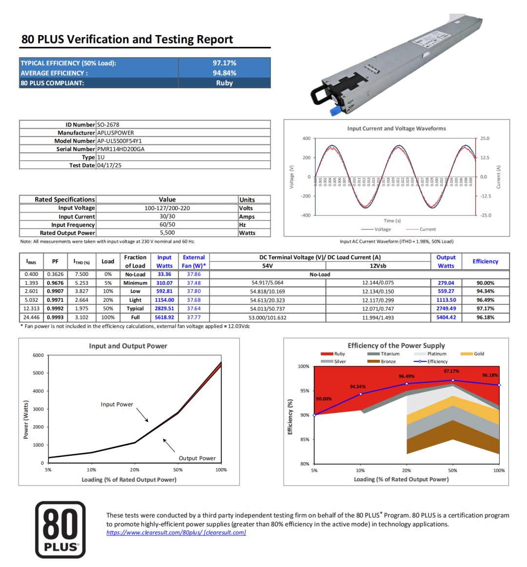 该电源采用1U紧凑型设计,额定功率高达5.5kW,兼具全场景适配性与出色能效表现:支持100-127Vac(北美)与200-220Vac(中国/欧洲)双电压档位,可实现全球电网无缝切换;50%负载效率达97.2%,满载效率稳定于96.2%,中高负载段功率因数接近0.999。配合54V母线加12V待机的电气架构,可完美对接数据中心主流48V配电系统。