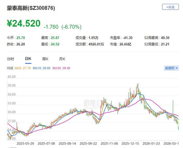 A股异动丨蒙泰高新午后跌逾7% 股价创逾9个月新低