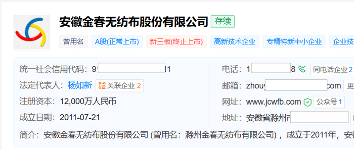 天眼查显示,金春股份成立于2011年7月,总部位于安徽省滁州市,2020年8月在深交所创业板上市,是一家专业从事非织造布材料、非织造布制品以及化学纤维的生产和销售的企业。