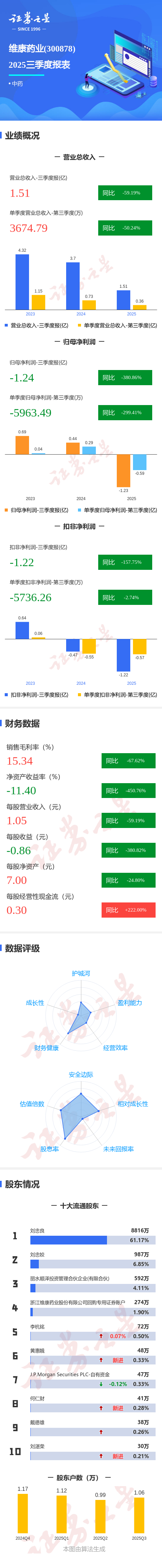 图解维康药业三季报:第三季度单季净利润同比下降299.41%
