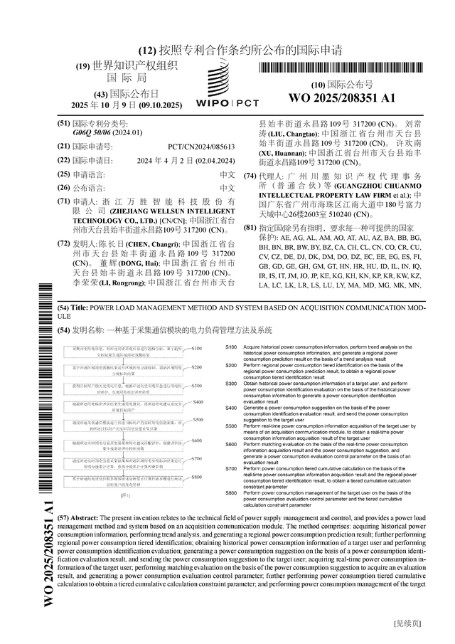 万胜智能公布国际专利申请:“一种基于采集通信模块的电力负荷管理方法及系统”