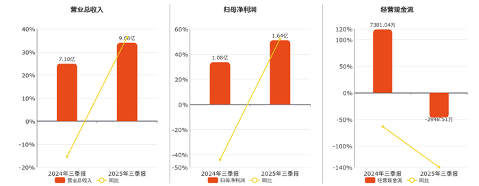 公司营业总收入为9.68亿元。归母净利润为1.64亿元。经营活动现金净流入为-2948.51万元,较去年同报告期经营活动现金净流入减少1.03亿元,同比较去年同期下降139.95%。