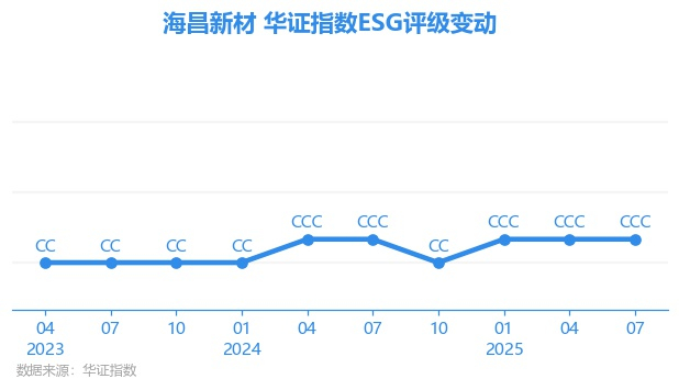 日前,华证指数公布了新一期(2025年7月31日)的ESG评级结果,海昌新材(300885.SZ)获得CCC评级(华证指数评级为C起至AAA九档,C为最低档,AAA为其最高一级评级/AA为其第二档),上一期(2025年4月30日)ESG评级为CCC。本期ESG评级在62家容器与包装行业A股上市公司中排名第23(上一期排名第26)。