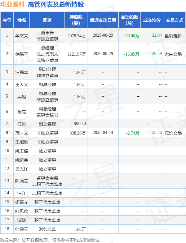 华业香料近半年内的董监高及核心技术人员增减持详情如下: