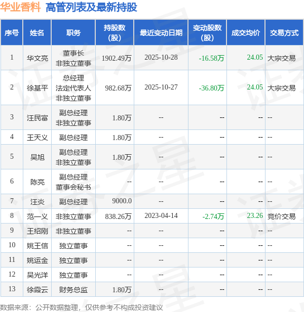 华业香料近半年内的董监高及核心技术人员增减持详情如下:
