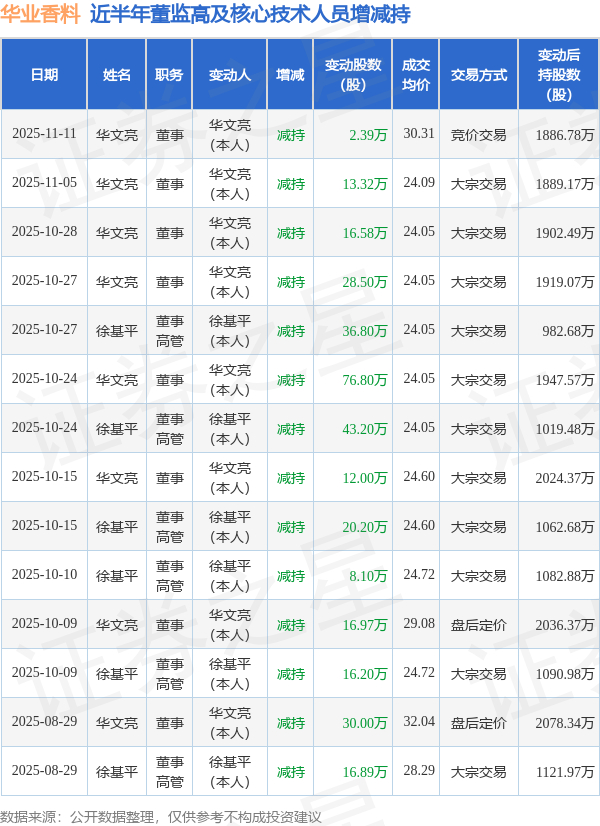 华业香料近半年内的董监高及核心技术人员增减持详情如下: