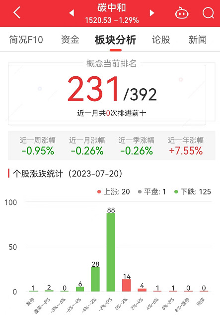 中国经济网北京7月20日讯 今日,碳中和板块整体跌幅1.29%,其中,20只股票上涨,1只股票平盘,125只股票下跌。
