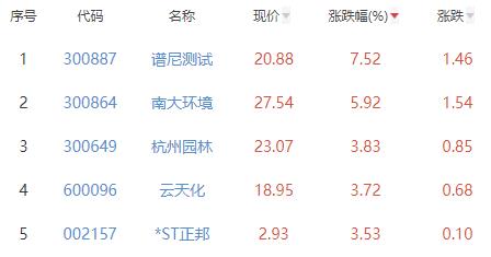 其中,谱尼测试、南大环境、杭州园林、云天化、*ST正邦位列板块涨幅前五位,涨幅分别为7.52%、5.92%、3.83%、3.72%、3.53%。