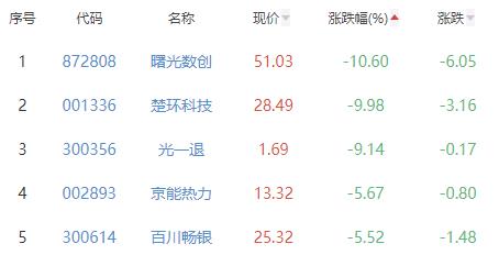曙光数创、楚环科技、光一退、京能热力、百川畅银位列涨幅榜后五位,涨幅分别为-10.60%、-9.98%、-9.14%、-5.67%、-5.52%。