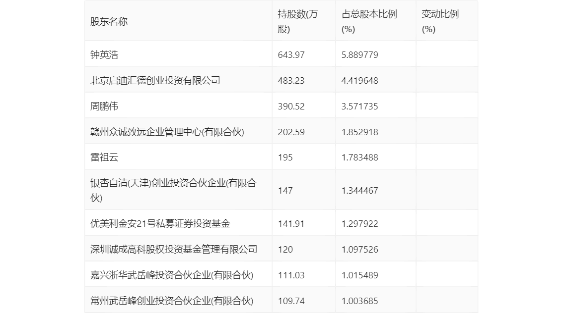 一季报显示,2024年一季度末公司十大流通股东中,新进股东为嘉兴浙华武岳峰投资合伙企业(有限合伙)、常州武岳峰创业投资合伙企业(有限合伙),取代了上年末的前海股权投资基金(有限合伙)、深圳市点石投资管理有限公司-深圳市点石创业投资合伙企业(有限合伙)。在具体持股比例上,优美利金安21号私募证券投资基金持股有所下降。