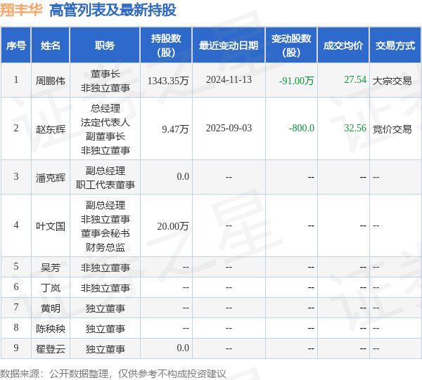 翔丰华近半年内的董监高及核心技术人员增减持详情如下: