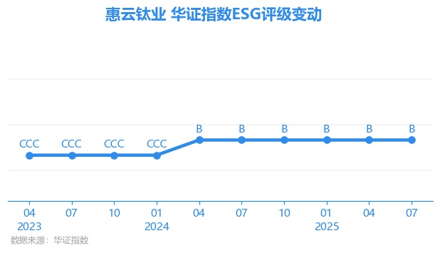 日前,华证指数公布了新一期(2025年7月31日)的ESG评级结果,惠云钛业(300891.SZ)获得B评级(华证指数评级为C起至AAA九档,C为最低档,AAA为其最高一级评级/AA为其第二档),上一期(2025年4月30日)ESG评级为B。本期ESG评级在462家化学制品行业A股上市公司中排名第187(上一期排名第186)。
