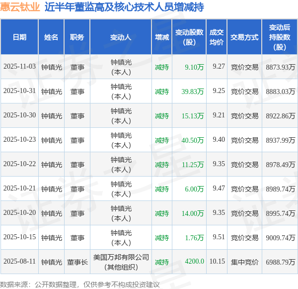 惠云钛业:11月3日高管钟镇光减持股份合计9.1万股