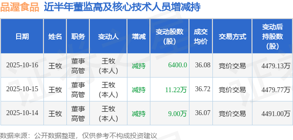 品渥食品:10月16日高管王牧减持股份合计6400股