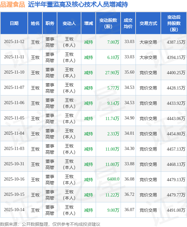 品渥食品:11月12日高管王牧减持股份合计7万股