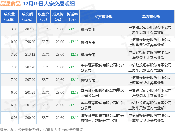 12月19日品渥食品现8笔折价12.19%的大宗交易 合计成交1928.64万元