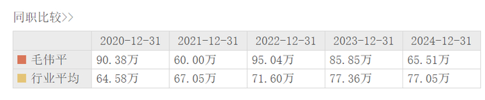 拉长时间来看,2020年至2024年,毛伟平薪酬分别为90.38万元、60万元、95.04万元、85.85万元及65.51万元,2024年其薪酬同比下降了23.69%。