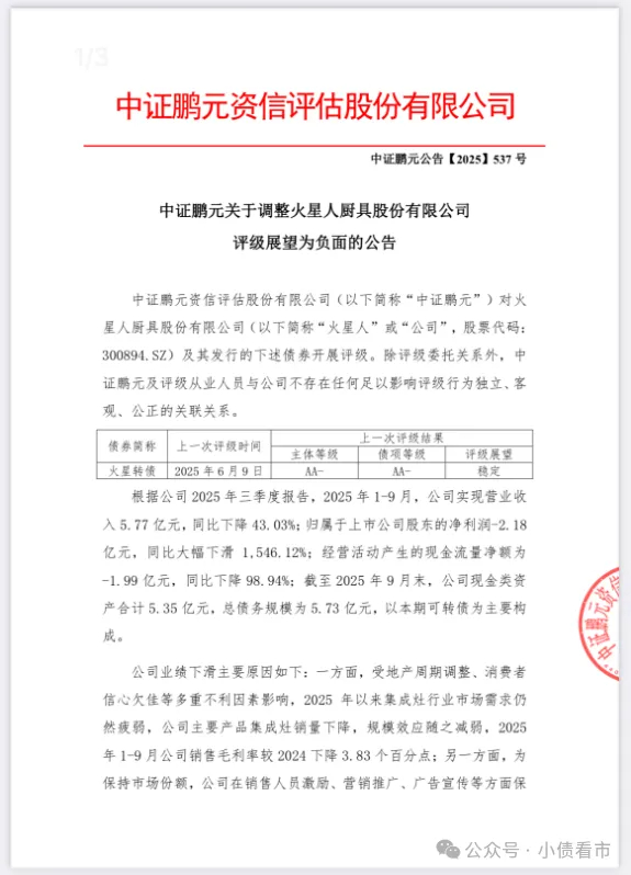 11月10日,中证鹏元公告称,维持火星人(300894.SZ)主体信用等级为“AA-”,评级展望调整为负面,“火星转债”信用等级维持为“AA-”。