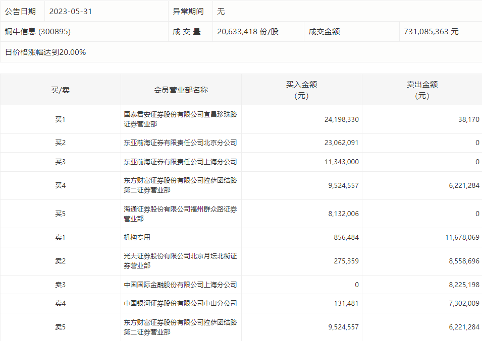5月31日,铜牛信息今日涨停,龙虎榜数据显示,上榜营业部席位全天成交1.2亿元,占当日总成交金额比例为16.35%。其中,买入金额为7752.33万元,卖出金额为4202.34万元,合计净买入3549.99万元。