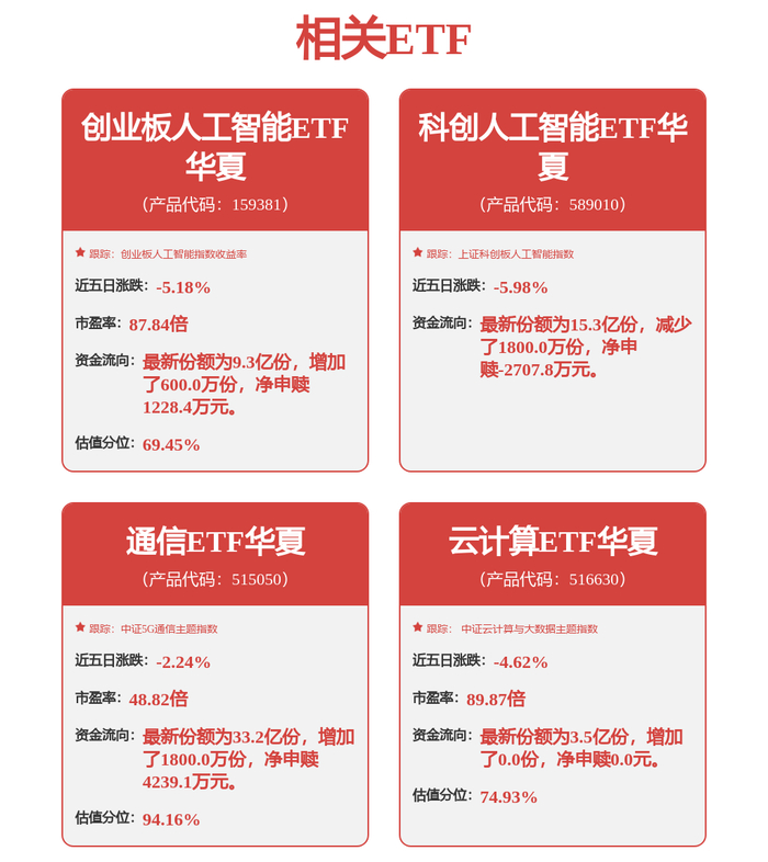 资金逢低布局趋势明显,近4天,创业板人工智能ETF华夏 (159381)连续资金净流入合计 7615.92 万元。通信ETF华夏(515050)连续吸金超1亿元。