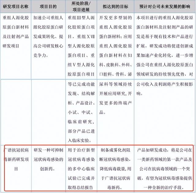 其实公司自2008年成立之初便锚定了功能蛋白研究领域,抗病毒的功能蛋白也是公司研发体系中非常重要的一环。仔细看看公司2021年之前的营收来源,还有抗HPV生物蛋白类产品,只不过当重组胶原蛋白开始快速增长后,这块业务就被掩盖了,不过公司一直有相应布局,看下图,公司的管线还有新冠雾化类的创新药。