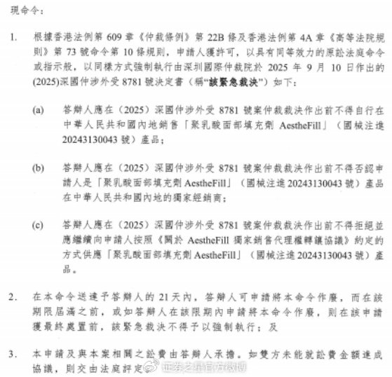 据悉,香港高等法院原讼法庭于2025年10月3日作出命令,批准申请人达透医疗的单方申请,许可其以法庭命令的方式,在香港强制执行深圳国际仲裁院于2025年9月10日作出的紧急裁决。