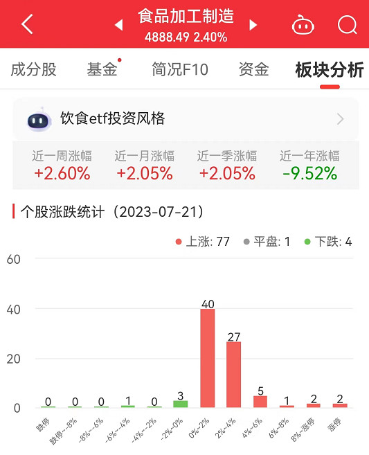 中国经济网北京7月21日讯 今日,食品加工制造板块整体涨幅2.40%,其中,77只股票上涨,1只股票平盘,4只股票下跌。