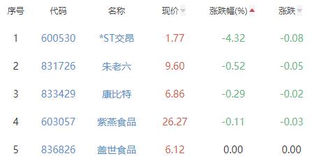 *ST交昂、朱老六、康比特、紫燕食品、盖世食品位列涨幅榜后五位,涨幅分别为-4.32%、-0.52%、-0.29%、-0.11%、0.00%。