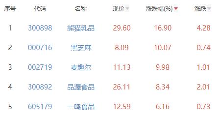 其中,熊猫乳品、黑芝麻、麦趣尔、品渥食品、一鸣食品位列板块涨幅前五位,涨幅分别为16.90%、10.07%、9.98%、8.34%、6.16%。