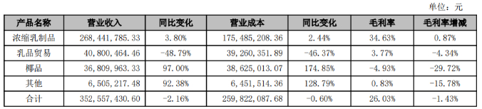 核心业务浓缩乳制品同样经营承压。2024年,公司浓缩乳制品实现营收5.85亿元,同比下滑10.06%,公司管理层称,2024年消费较弱,业绩面临一定的压力。今年上半年,浓缩乳制品实现营收同比小幅增长3.8%至2.68亿元,但各细分产品的表现呈现分化。