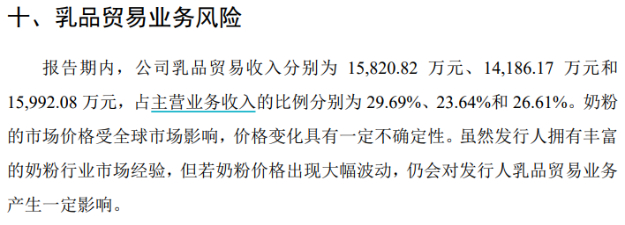 2020年至2023年,乳品贸易业务可以为熊猫乳品贡献超两成的营收,2024年,该业务营收占比下滑至16.53%,但仍占据公司第二大收入板块的位置。不过该业务潜在风险也难以规避——公司2020年披露的招股书中,曾提到奶粉的市场价格受全球市场影响,价格变化具有一定不确定性,若奶粉价格出现大幅波动,会对公司乳品贸易产生一定影响。