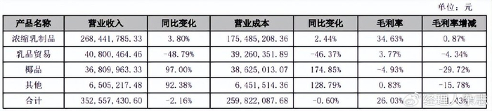 核心业务浓缩乳制品同样经营承压。2024年,公司浓缩乳制品实现营收5.85亿元,同比下滑10.06%,公司管理层称,2024年消费较弱,业绩面临一定的压力。今年上半年,浓缩乳制品实现营收同比小幅增长3.8%至2.68亿元,但各细分产品的表现呈现分化。