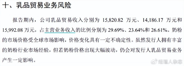 2020年至2023年,乳品贸易业务可以为熊猫乳品贡献超两成的营收,2024年,该业务营收占比下滑至16.53%,但仍占据公司第二大收入板块的位置。不过该业务潜在风险也难以规避——公司2020年披露的招股书中,曾提到奶粉的市场价格受全球市场影响,价格变化具有一定不确定性,若奶粉价格出现大幅波动,会对公司乳品贸易产生一定影响。
