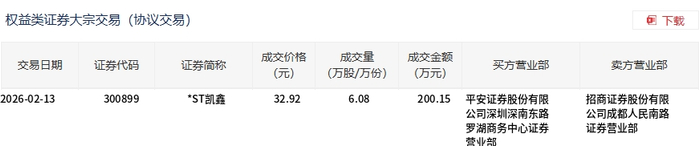 2月13日,*ST凯鑫大宗交易成交6.08万股,成交额200.15万元,占当日总成交额的13.15%,成交价32.92元,较市场收盘价34.3元折价4.02%。