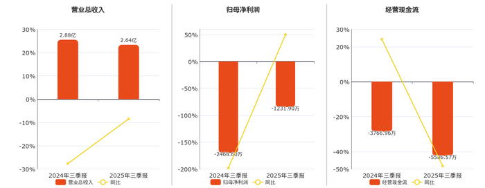 公司营业总收入为2.64亿元,较去年同报告期营业总收入减少2444.28万元,同比较去年同期下降8.48%。归母净利润为-1231.90万元。经营活动现金净流入为-5586.57万元,较去年同报告期经营活动现金净流入减少1819.61万元。