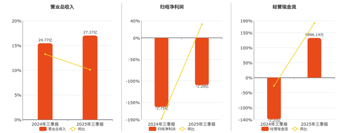 公司营业总收入为27.27亿元。归母净利润为-1.20亿元,在已披露的同业公司中排名第53。经营活动现金净流入为9896.14万元,在已披露的同业公司中排名第32。