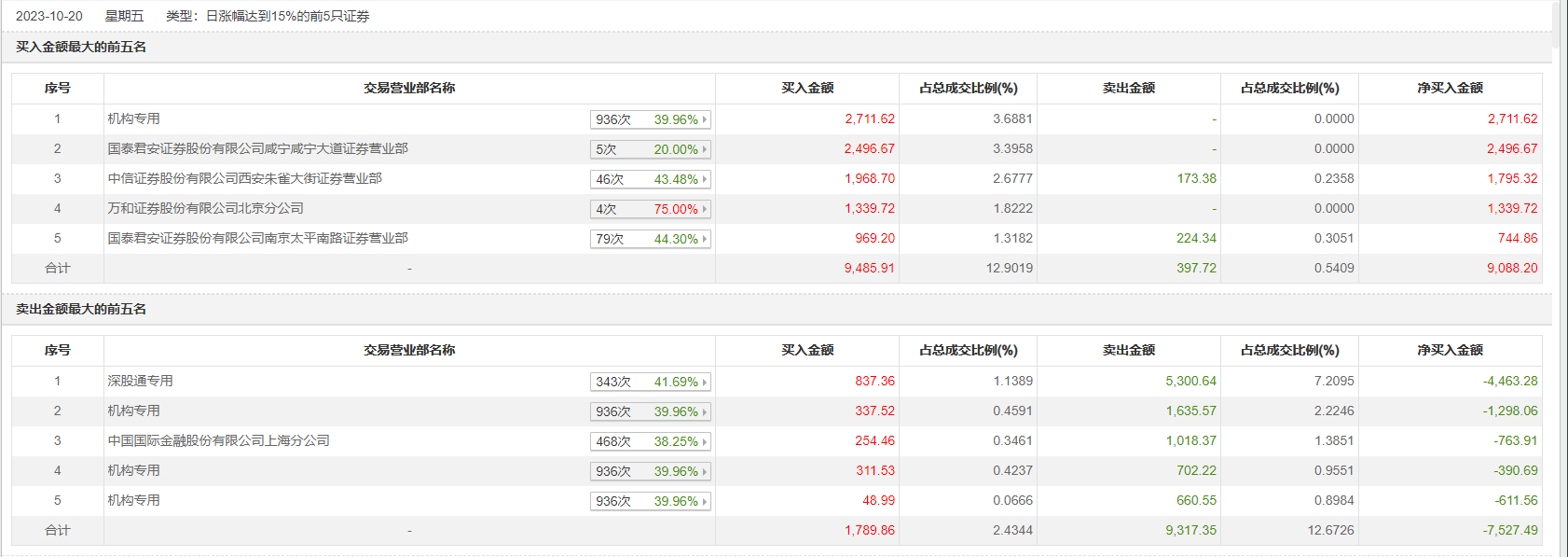 10月20日,威力传动今日涨停,龙虎榜数据显示,上榜营业部席位全天成交2.1亿元,占当日总成交金额比例为28.55%。其中,买入金额为1.13亿元,卖出金额为9715.06万元,合计净买入1560.71万元。