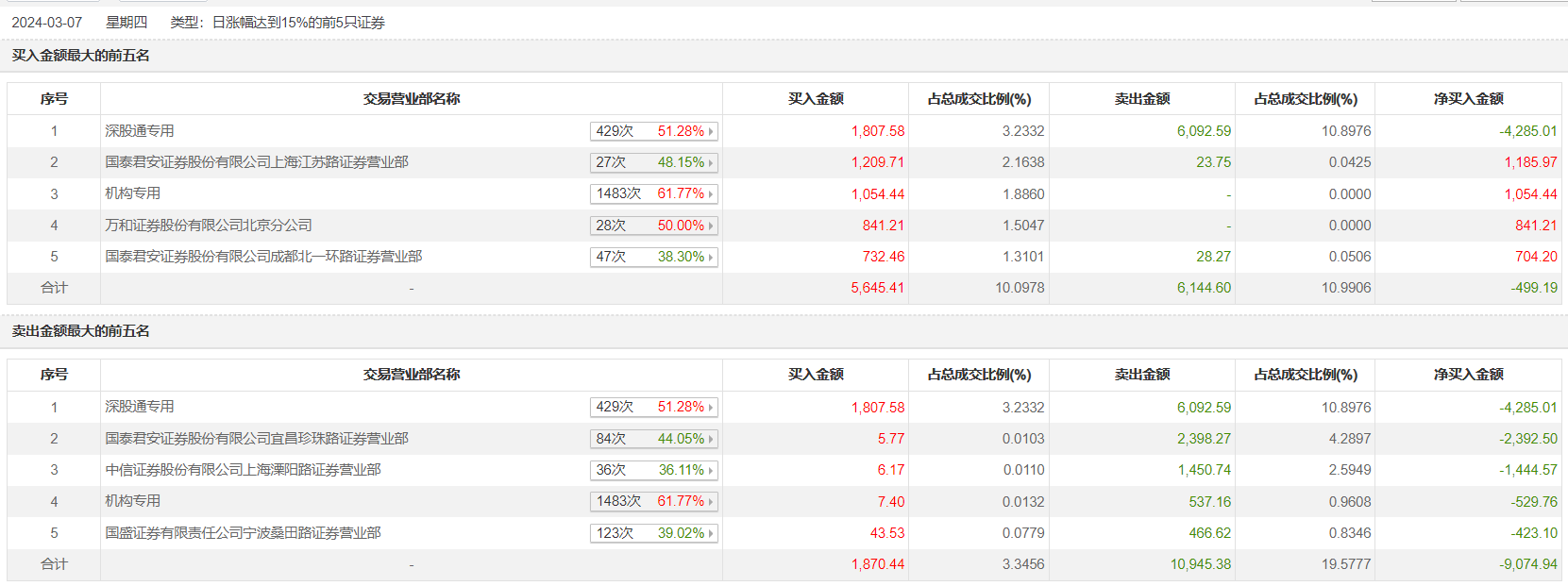 威力传动3月7日涨停,龙虎榜数据显示,上榜营业部席位全天成交1.67亿元,占当日总成交金额比例为29.88%。其中,买入金额为5708.28万元,卖出金额为1.1亿元,合计净卖出5289.12万元。