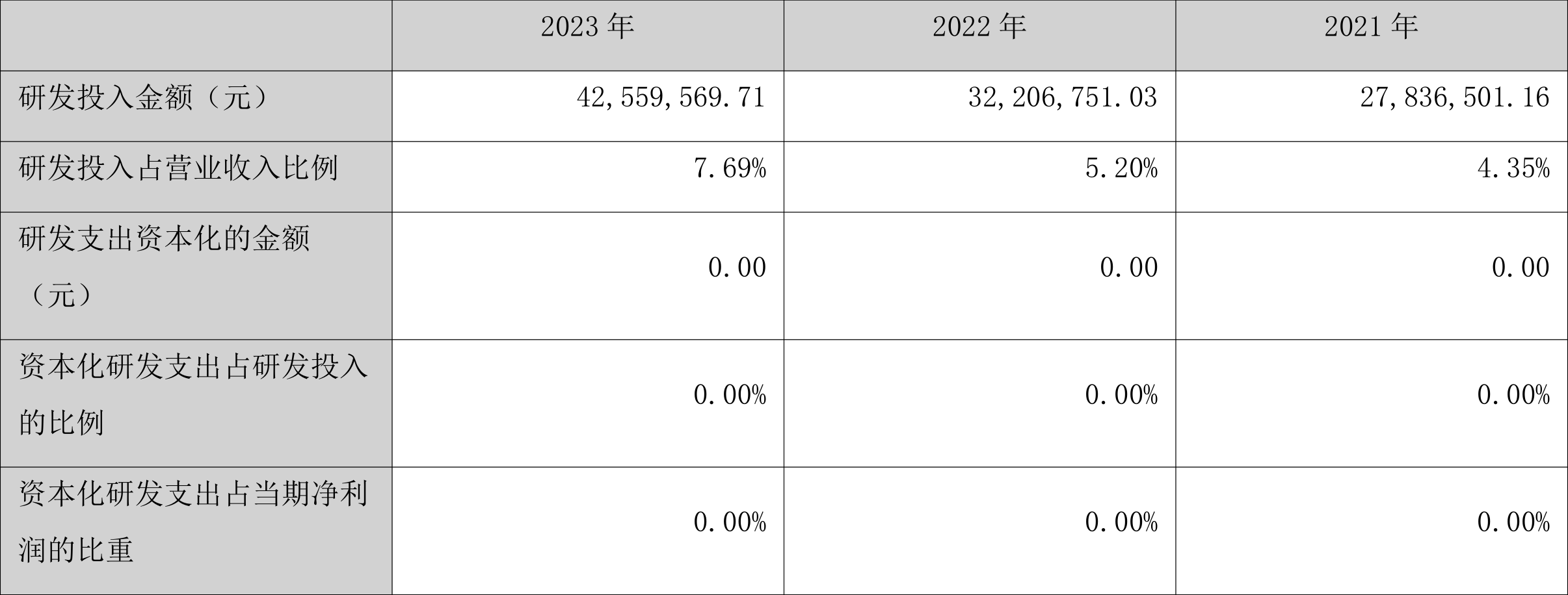 2023年全年,公司研发投入金额为4255.96万元,同比增长32.14%;研发投入占营业收入比例为7.69%,相比上年同期上升2.49个百分点。此外,公司全年研发投入资本化率为0。