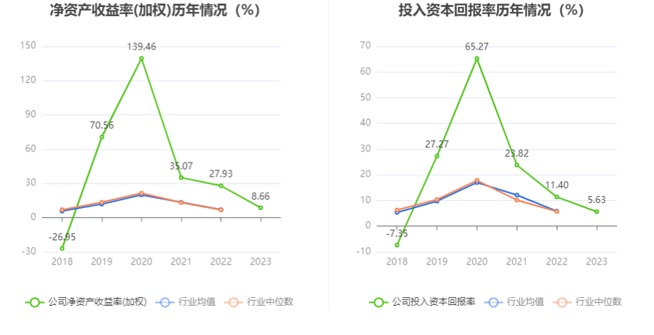 数据显示,2023年公司加权平均净资产收益率为8.66%,较上年同期下降19.27个百分点;公司2023年投入资本回报率为5.63%,较上年同期下降5.77个百分点。