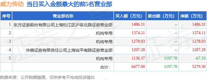 证券之星消息,沪深交易所2025年9月26日公布的交易公开信息显示,威力传动(300904)因日涨幅达到15%的前5只证券登上龙虎榜。此次是近5个交易日内第1次上榜。