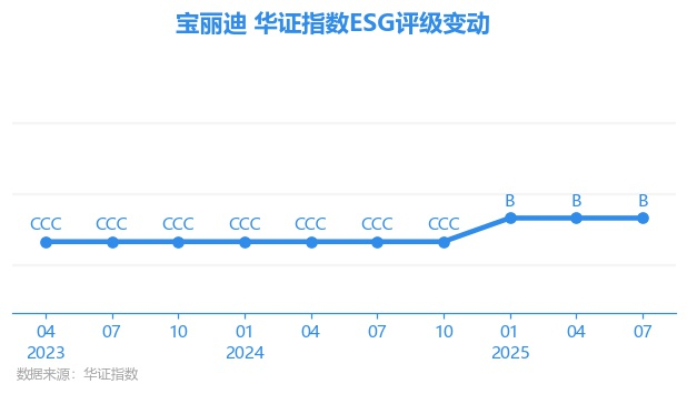 日前,华证指数公布了新一期(2025年7月31日)的ESG评级结果,宝丽迪(300905.SZ)获得B评级(华证指数评级为C起至AAA九档,C为最低档,AAA为其最高一级评级/AA为其第二档),上一期(2025年4月30日)ESG评级为B。本期ESG评级在462家化学制品行业A股上市公司中排名第191(上一期排名第194)。