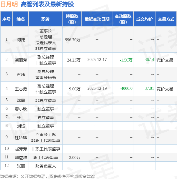 日月明的高管列表及最新持股情况如下: