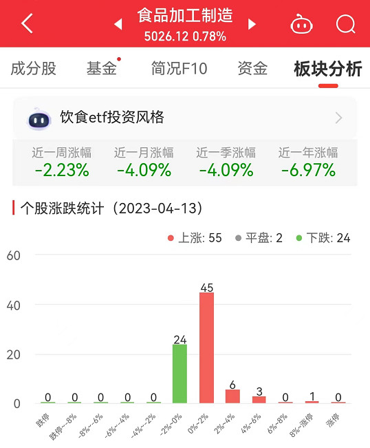 中国经济网北京4月13日讯 今日,食品加工制造板块整体涨幅0.78%,其中,55只股票上涨,2只股票平盘,24只股票下跌。