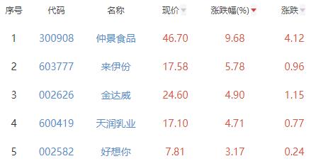 其中,仲景食品、来伊份、金达威、天润乳业、好想你位列板块涨幅前五位,涨幅分别为9.68%、5.78%、4.90%、4.71%、3.17%。