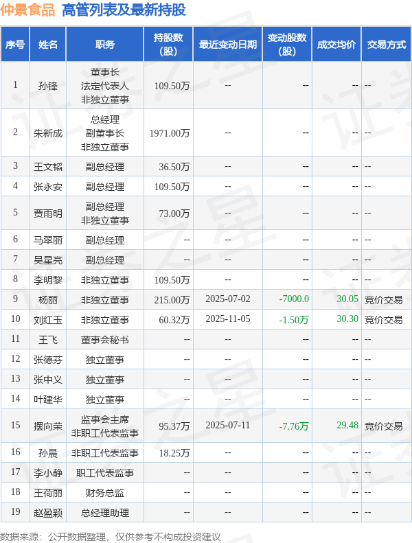 仲景食品的高管列表及最新持股情况如下: